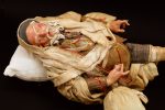 Tipico personaggio della cultura napoletana, testa in terracotta occhi cristallo dipinta a olio mani e piedi in legno corpo in stoppa abiti in seta di San Leucio. Ceste in cera.
