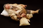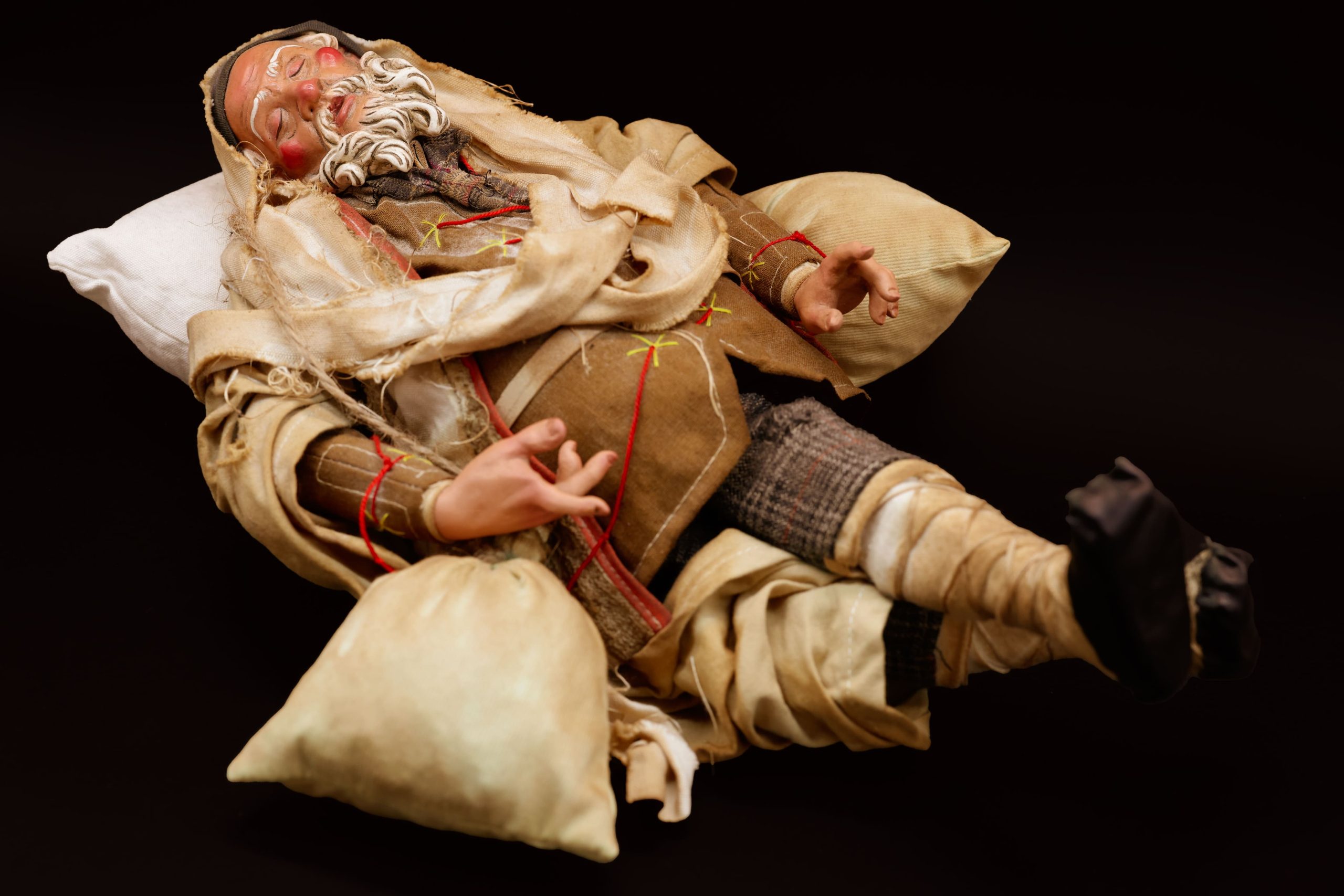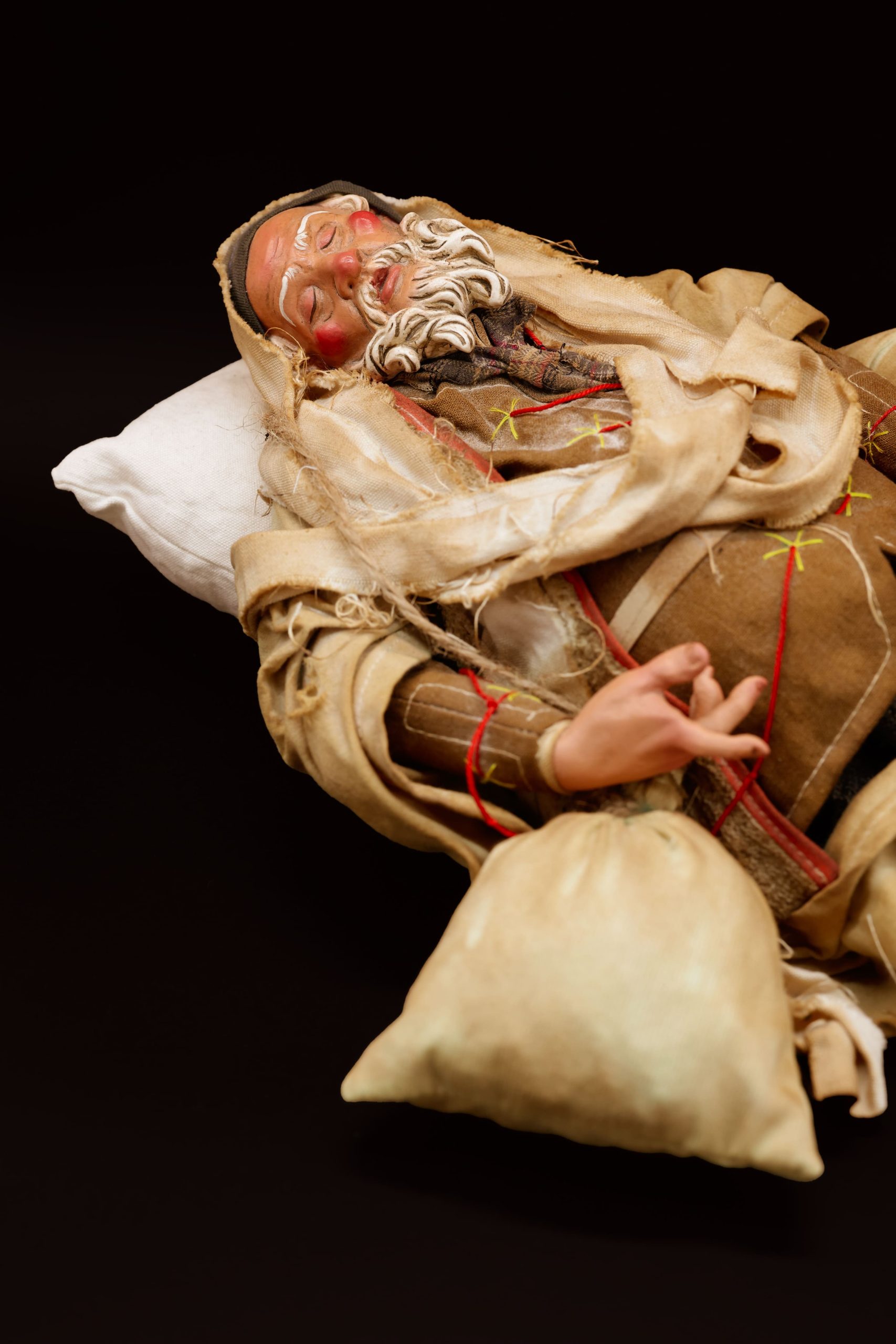 Tipico personaggio del presepe napoletano, arti in legno, vestito in lino e drappi di cotone.