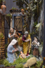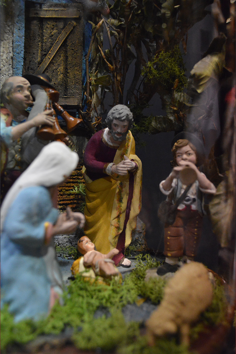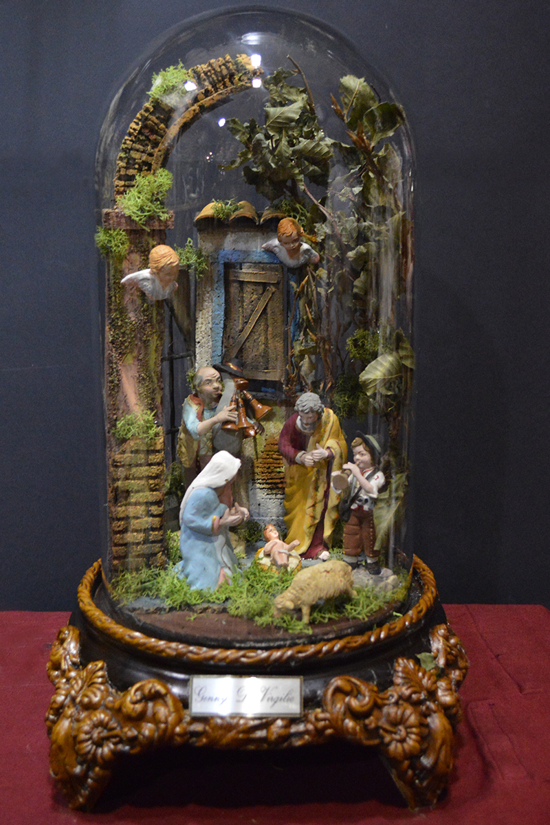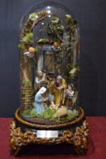 Presepe in campana composto da campana di vetro su base in legno intagliato, presepe in sughero e pastori di cm 30 con testa in terracotta, mani e piedi in legno, vestiti con seta di San Leucio.