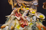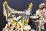Pastore macellaio con testa in terracotta, occhi in cristallo, mani e piedi in legno snodabili e vestito in seta di San Leucio; banchetto in legno; carne in cera;