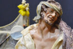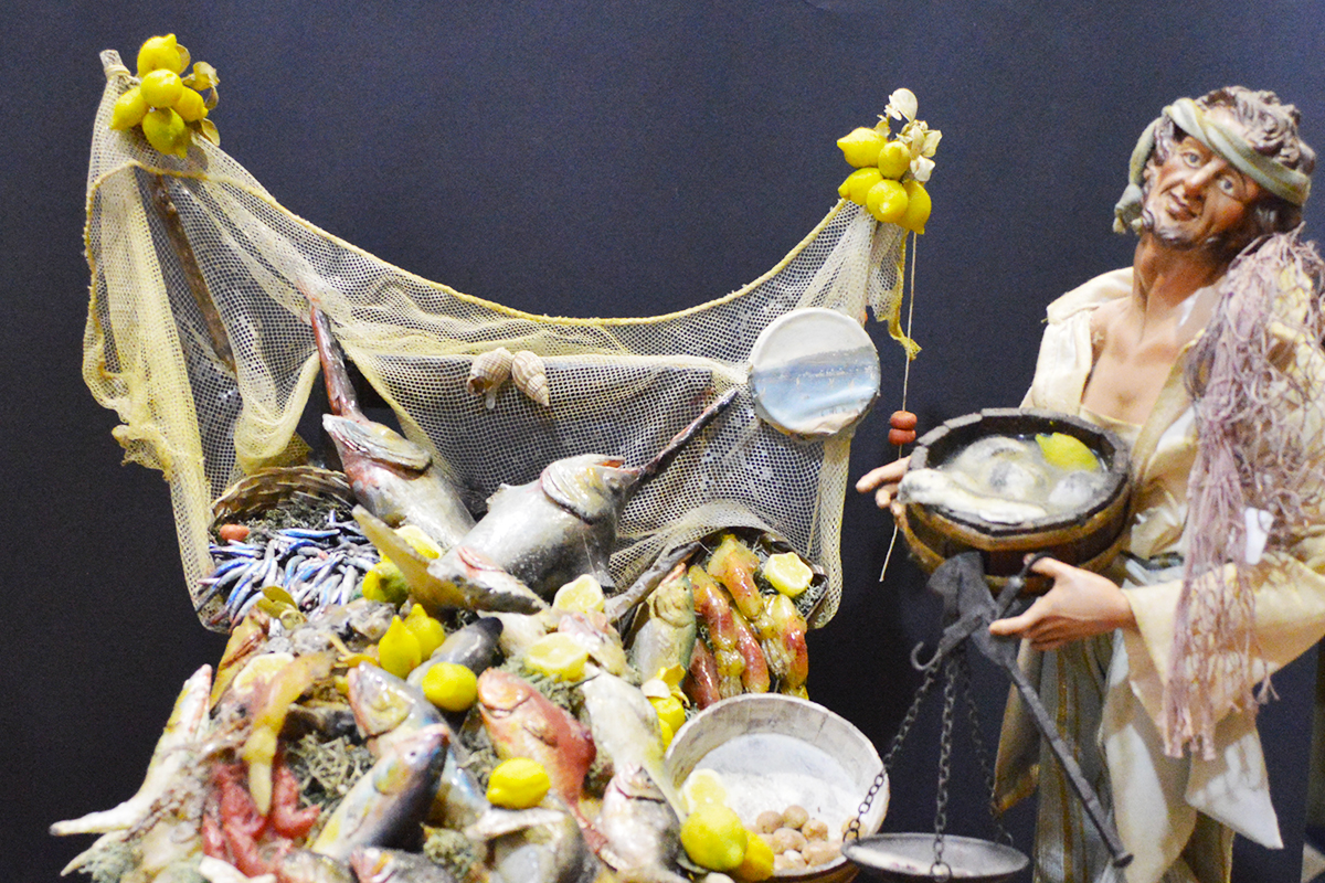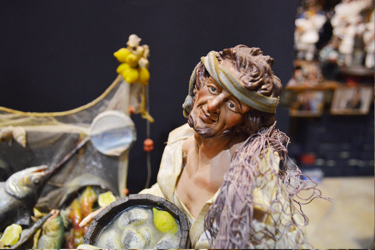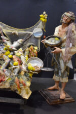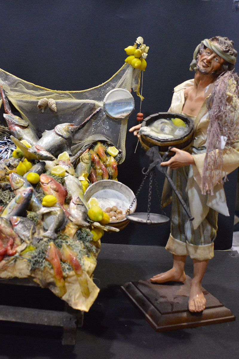 Pastore pescivendolo con testa in terracotta, occhi in cristallo, mani e piedi in legno snodabili e vestito in set di San Leucioa; banchetto in legno; pesci in cera;