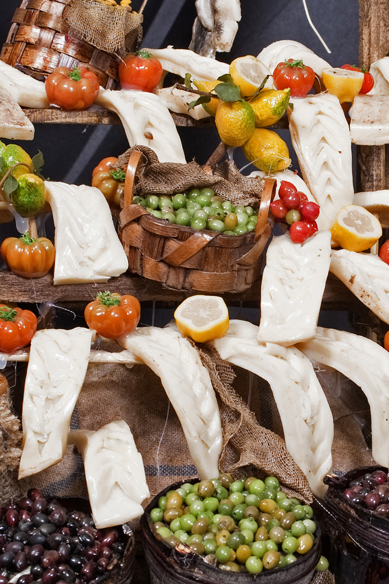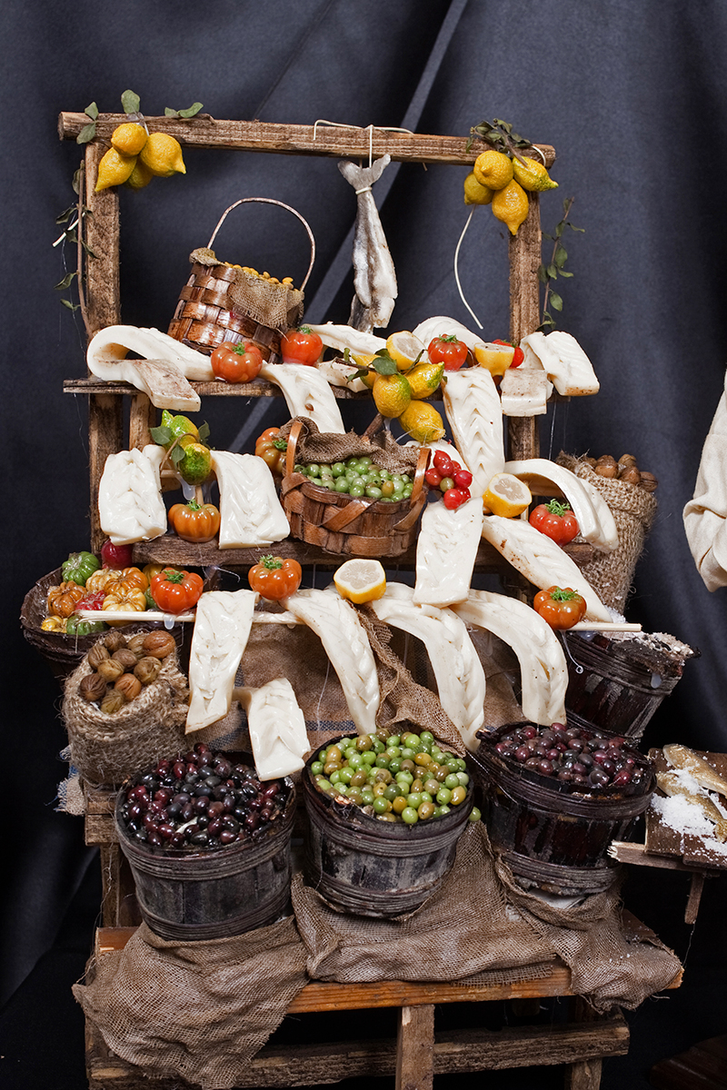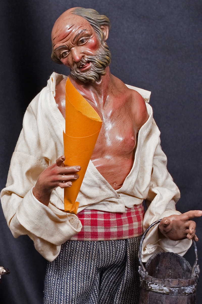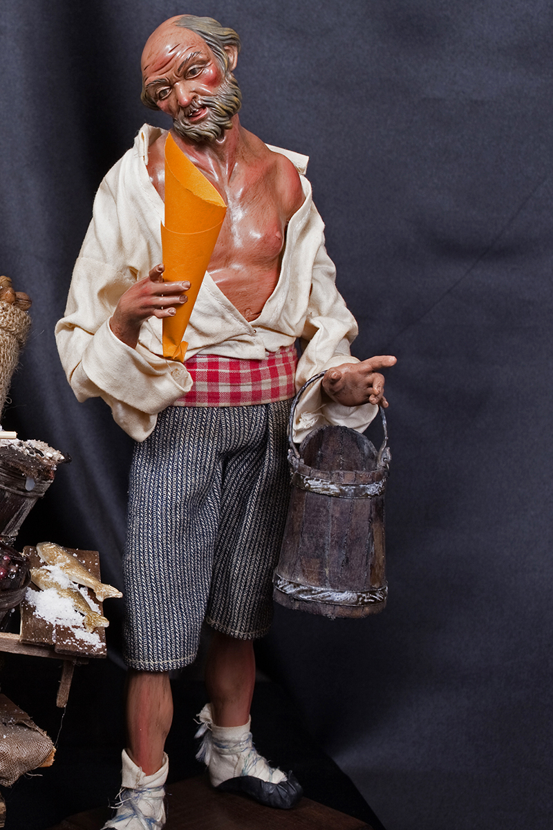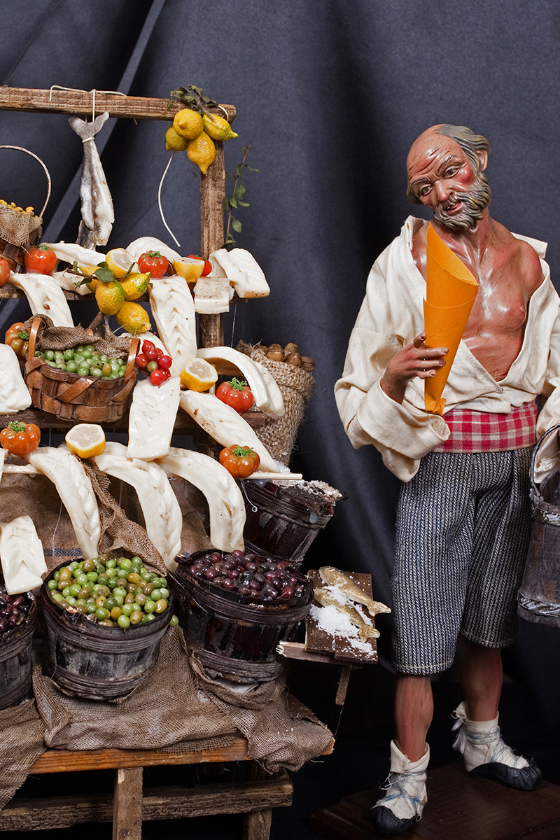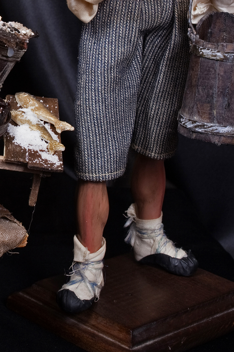Pastore venditore di baccalà con testa in terracotta, occhi in cristallo, mani e piedi in legno snodabili e vestito in seta; banchetto in legno; baccalà in cera;