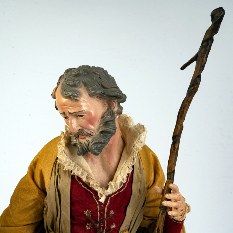 Opera con testa in terracotta, occhi di cristallo, corpo di stoppa e vestitura in Seta di San Leucio impreziosita da trinette in oro antico.