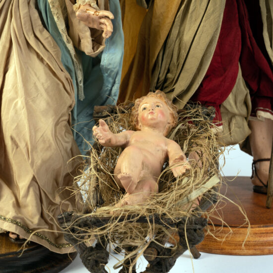 Maria e San Giuseppe con testa in terracotta, occhi di vetro, mani e piedi in legno snodabili e vestitura in seta di San Leucio; Bambino in terracotta; Completa di base indorata in oro fino.