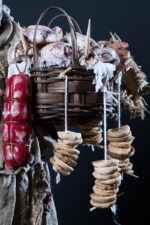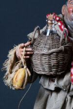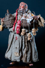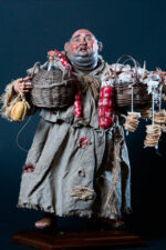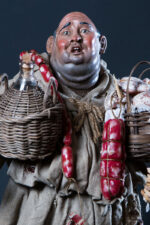 Pastore macellaio con testa in terracotta, occhi in cristallo, mani e piedi in legno snodabili e vestito in seta di San Leucio; banchetto in legno; carne in cera;