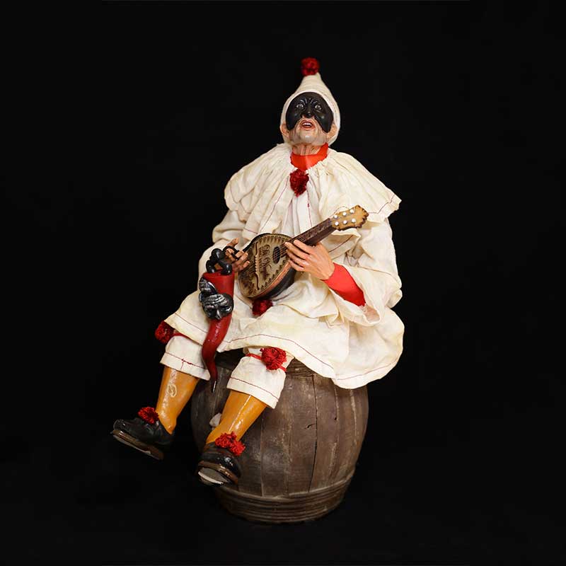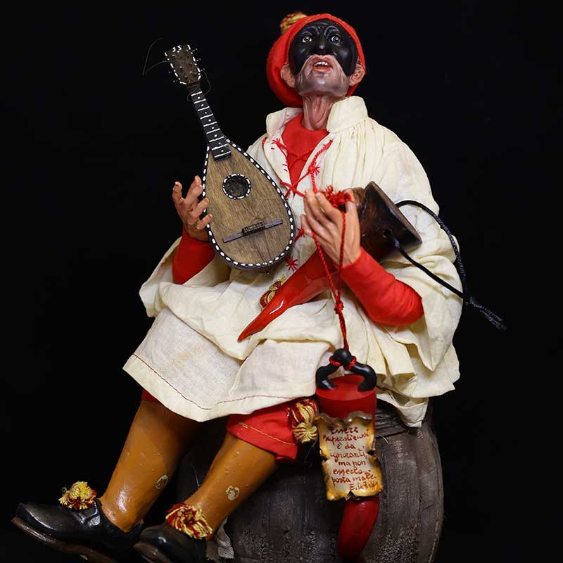 Pulcinella con testa in terracotta, occhi in cristallo, mani e piedi in legno snodabili e vestito in seta; Strumento e botte in legno. Misura: 45 cm N.B.: Il prodotto è un pezzo unico in quanto creato interamente a mano, per cui l’ordine può variare nei dettagli e nelle stoffe. Il Prezzo é Incluso IVA