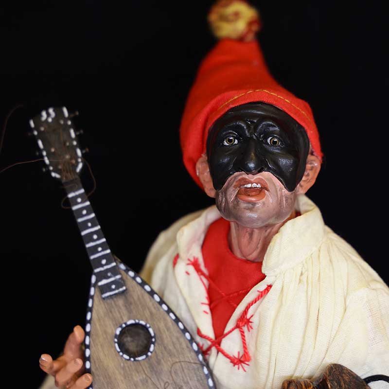 Pulcinella con testa in terracotta, occhi in cristallo, mani e piedi in legno snodabili e vestito in seta; Strumento in legno; Completo di base in legno. Misura: 45 cm N.B.: Il prodotto è un pezzo unico in quanto creato interamente a mano, per cui l’ordine può variare nei dettagli e nelle stoffe. prezzo incluso iva