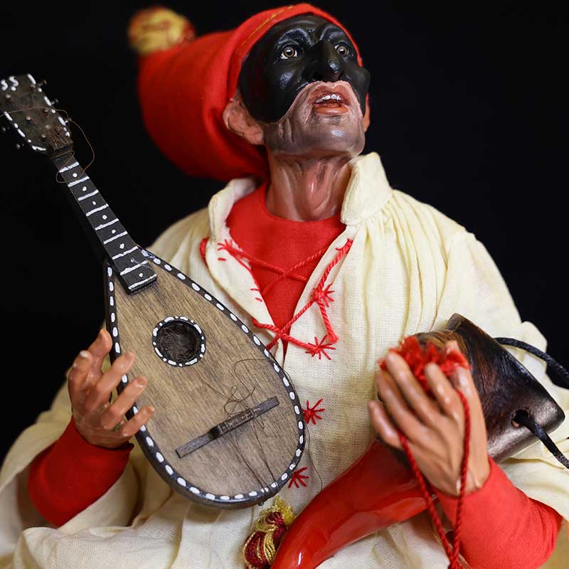 Tipico personaggio della cultura napoletana. Testa in terracotta, occhi in cristallo, dipinta a olio mani e piedi in legno, corpo in stoppa e abiti in seta di San Leucio. Il prodotto è un pezzo unico in quanto creato interamente a mano, per cui l’ordine può variare nei dettagli e nelle stoffe. Di Virgilio dal 1830 Maestri del Presepe Napoletano