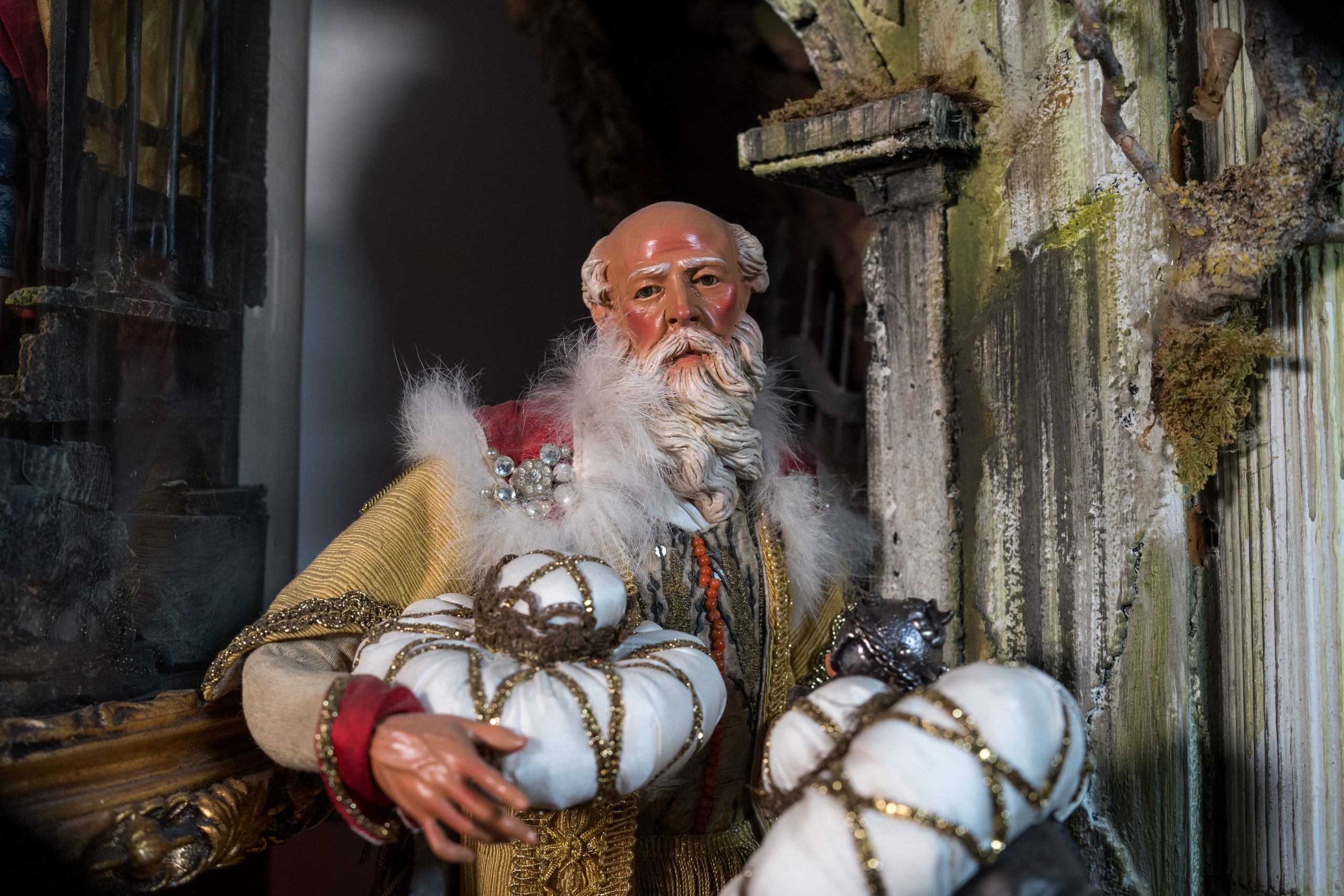 Trio dei Re Magi con testa in terracotta, occhi in vetro, mani e piedi in legno snodabili e abito in seta di San Leucio impreziosito da trinette in oro fino;