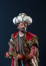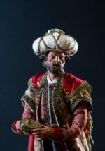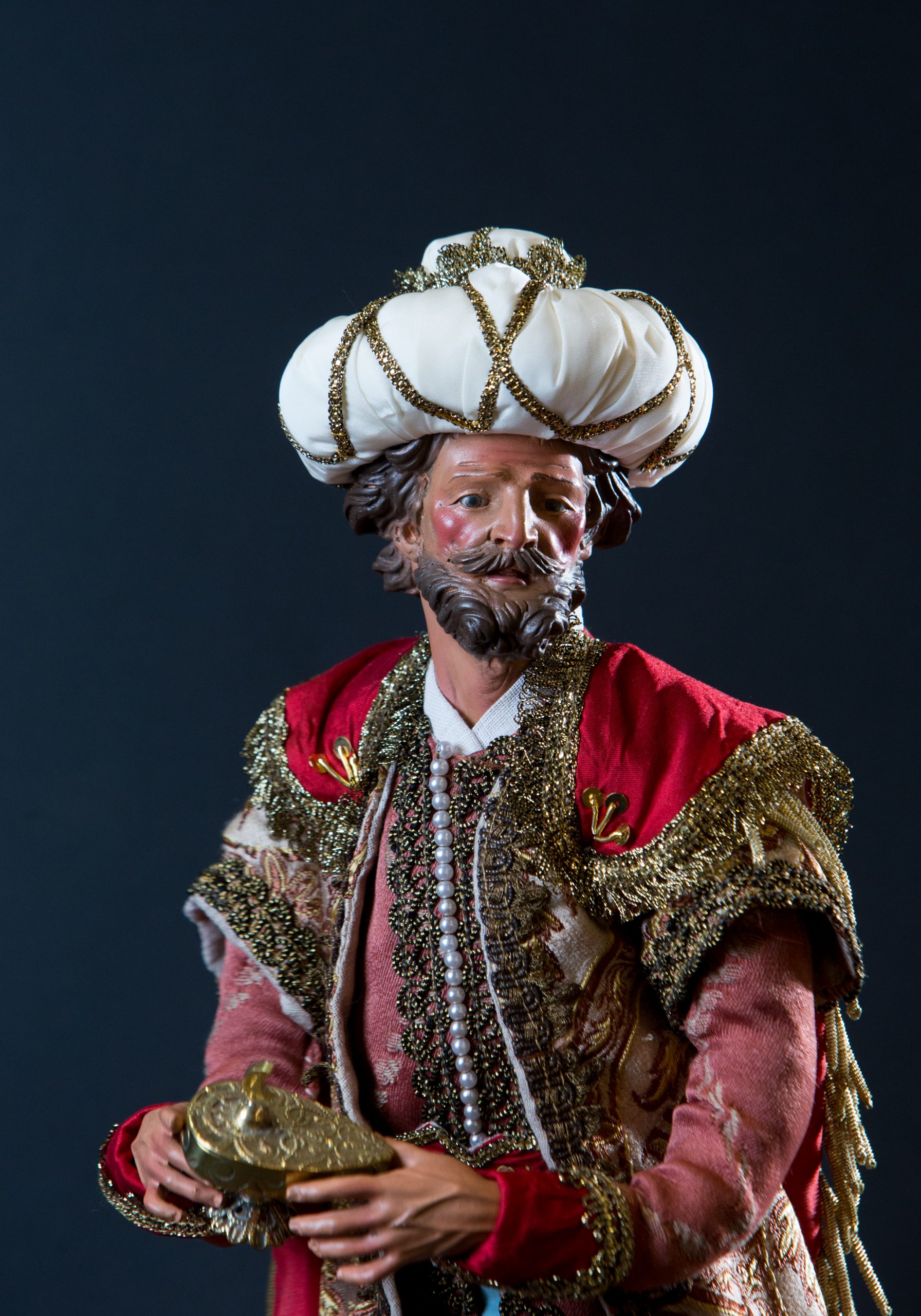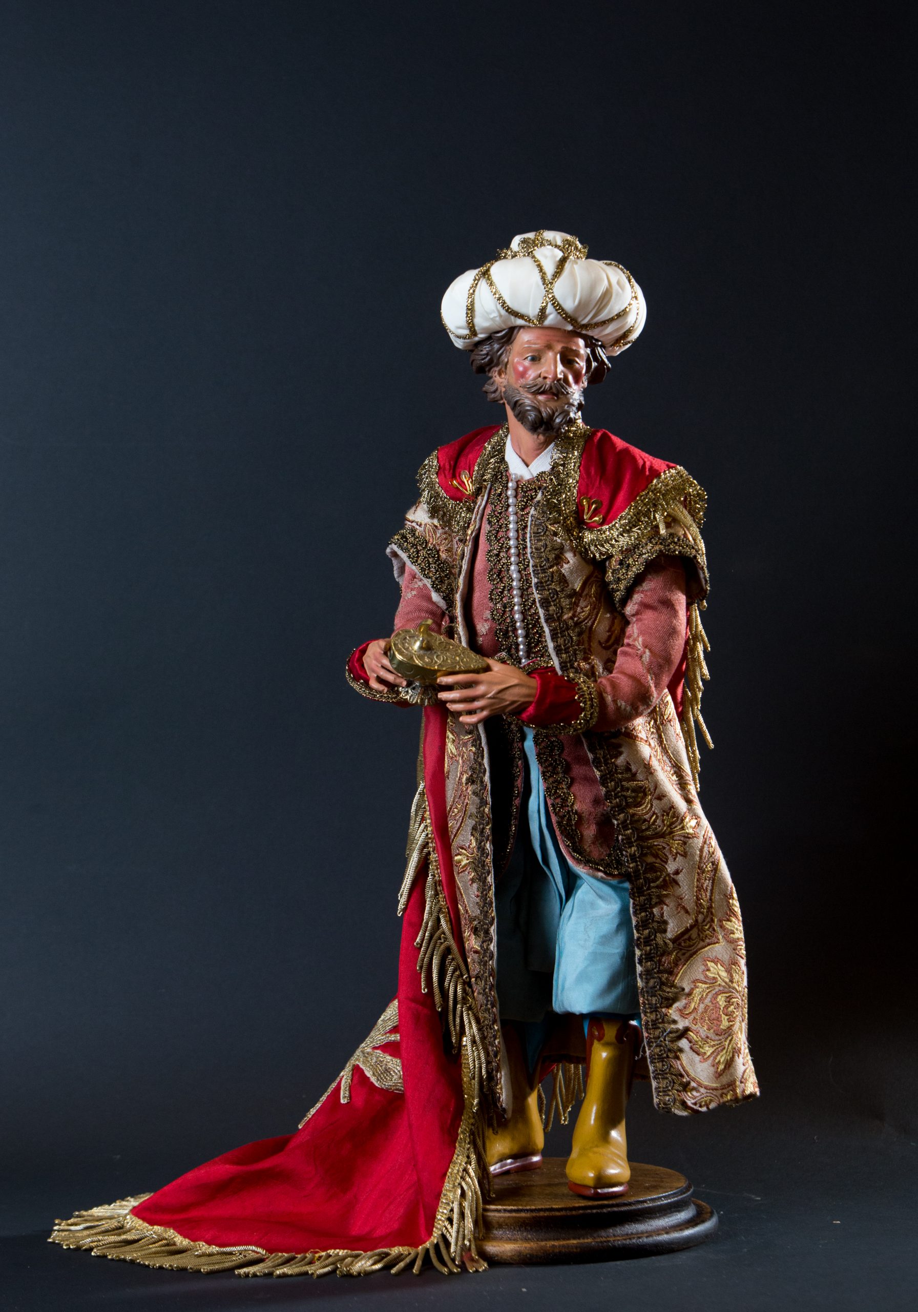 Trio dei Re Magi con testa in terracotta, occhi in vetro, mani e piedi in legno snodabili e abito in seta di San Leucio impreziosito da trinette in oro fino; Misure: 30 cm N.B.: Il prodotto è un pezzo unico in quanto creato interamente a mano, per cui l’ordine può variare nei dettagli e nelle stoffe.