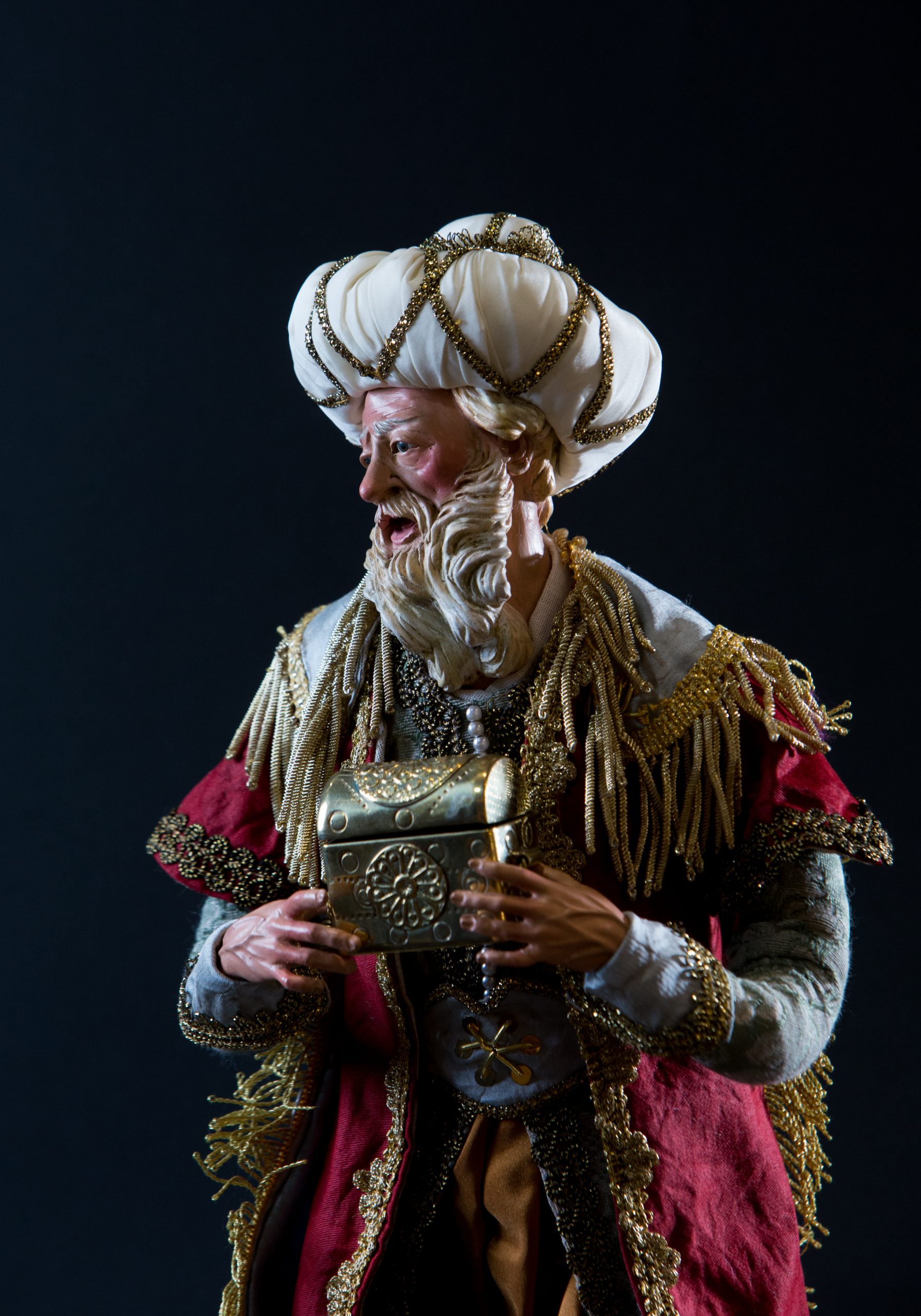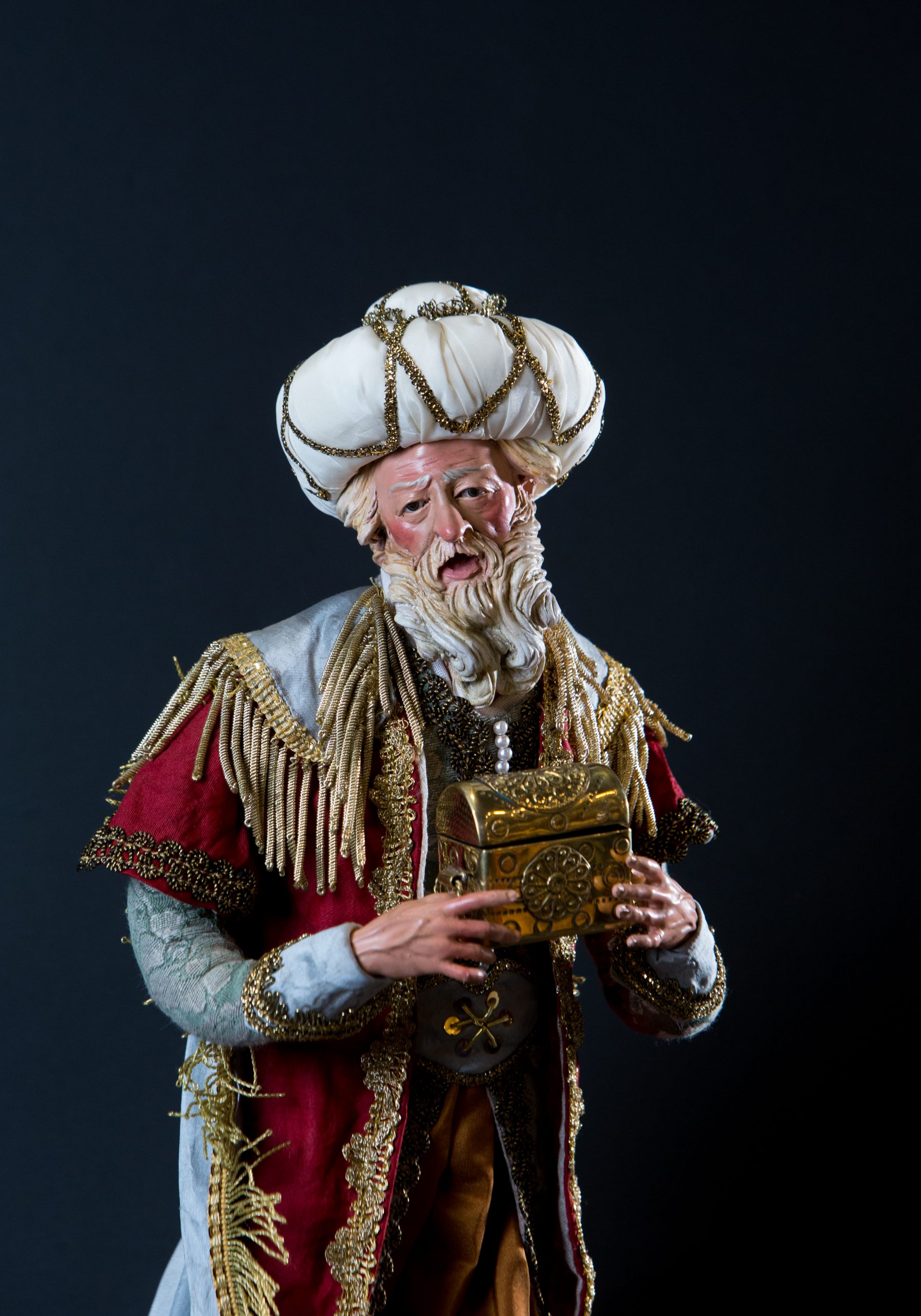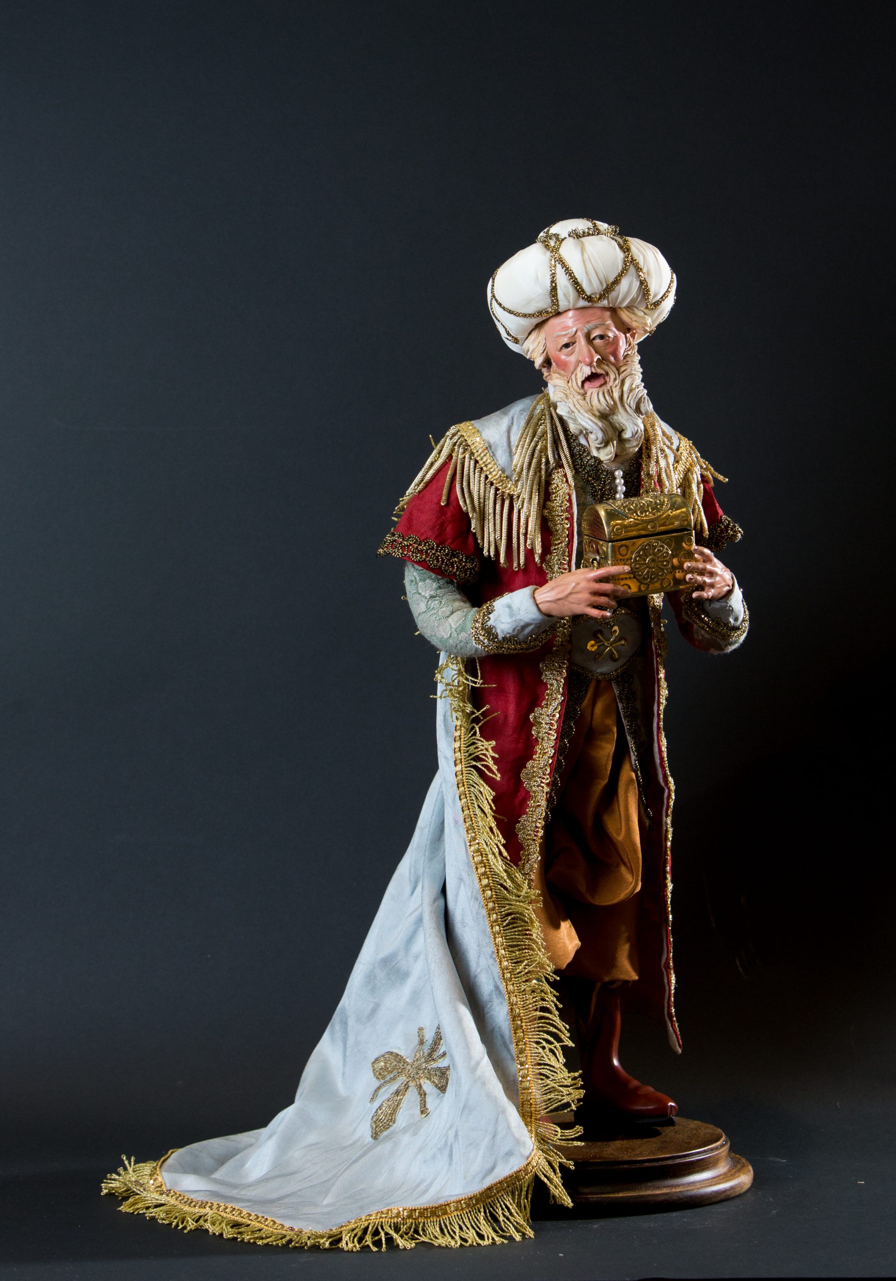 I Re Magi con testa in terracotta, occhi di vetro,  mani e piedi in legno e  abiti in seta di San Leucio, rifiniture e ricami in oro e argento Misura: 30 cm N.B.: Il prodotto è un pezzo unico in quanto creato interamente a mano, per cui l’ordine può variare nei dettagli e nelle stoffe.