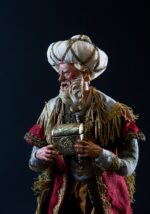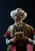 Testa in terracotta occhi cristallo dipinta a olio, mani e piedi in legno, corpo in stoppa e abiti in seta san leucio con passamanerie in oro fino. Il prodotto è un pezzo unico in quanto creato interamente a mano, per cui l’ordine può variare nei dettagli e nelle stoffe. Di Virgilio dal 1830 Maestri del Presepe Napoletano