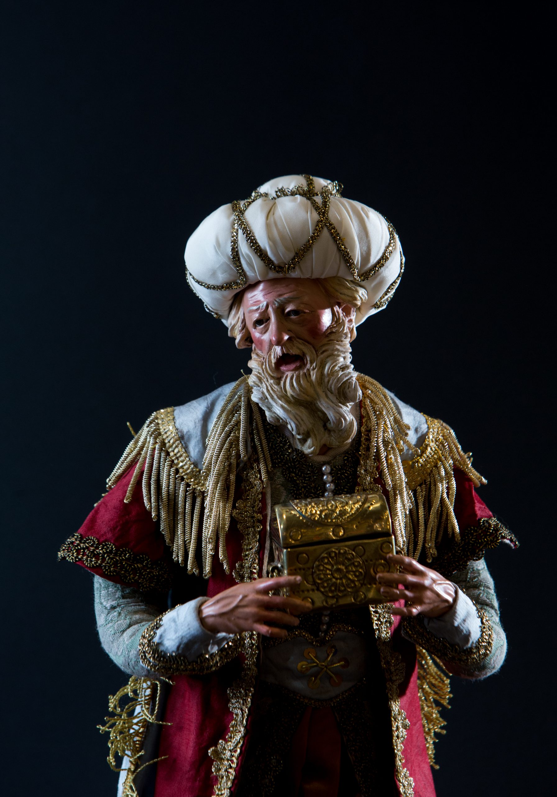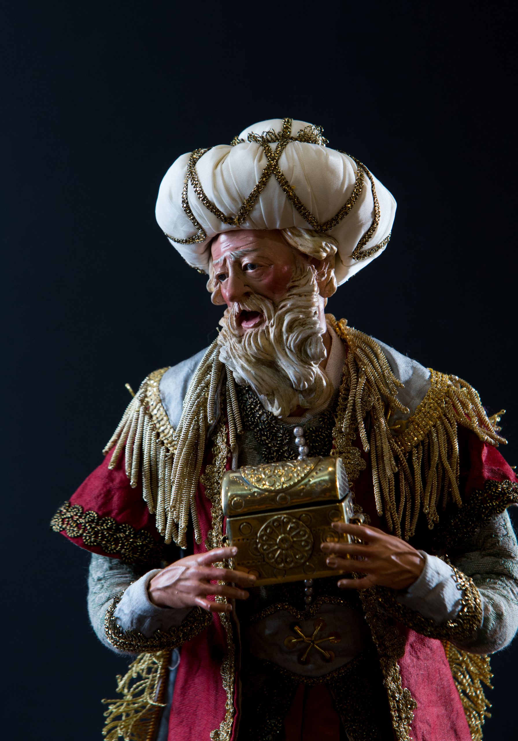 Re Magio con testa in terracotta, occhi in cristallo, mani e piedi in legno snodabili e vestito in seta.